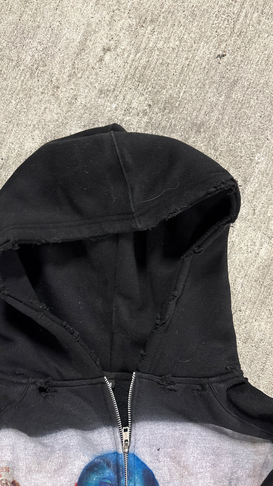 “Life sucks“ black distressed zip up